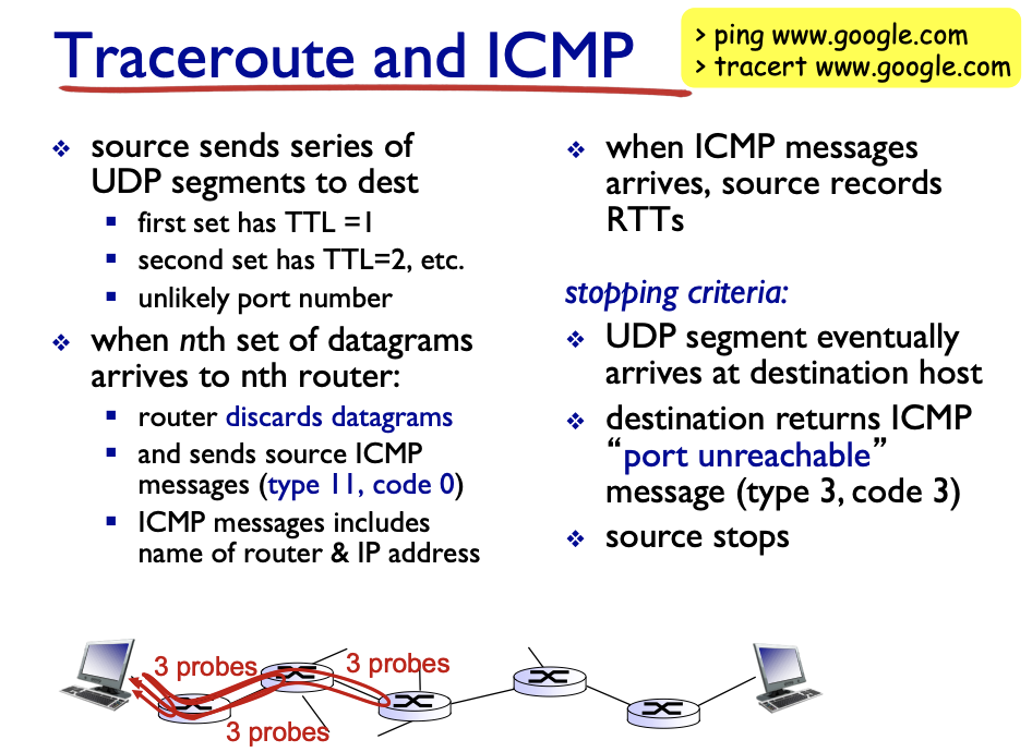 이러한 ICMP의 특징을 이용해 Traceroute를 확인할 수 있다. Traceroute는 End-system 에서 출발해 특정 라우터에 도달했다가 다시 End-system으로 돌아올 동안 걸리는 시간을 의미한다.