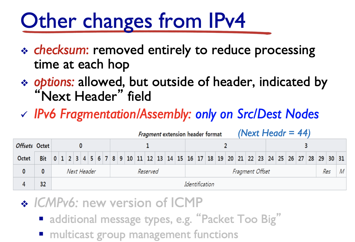 + Source와 Destination 에서만 Fragmentation을 처리하고, 중간 라우터에서는 하지 않음.