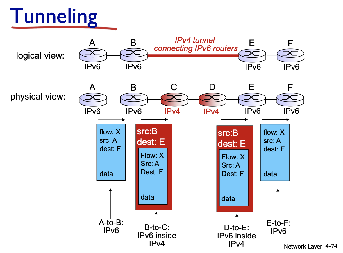 결국 이렇게 IPv4와 IPv6가 공존해야 한다는 것이다. 현재 A -> B -> C -> D -> E -> F 로 데이터를 보내는 과정에서, C와 D 라우터는 IPv4를 지원하기 때문에 IPv6가 지나갈 수가 없는 상황인데, 이 때 IPv6를 IPv4로 감싸서 보내면 C,D를 통과할 수 있게된다. 이 과정 자체가 터널링 인 것이고, IPv6는 IPv4 안에 캡슐화되었다고 할 수 있겠다.
