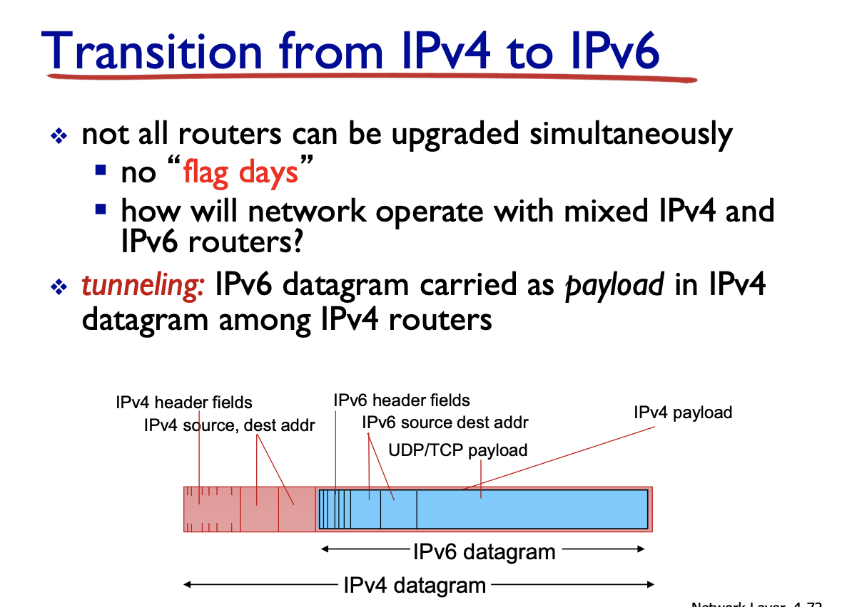 이는 IPv4 datagram을 보낼적에 IPv6 datagram을 쏙 넣어서 보내는 것이다. 예를 들어, 차를 끌고 섬에 가고 싶을때, 배에 나의 차를 싣고 이동하는 것을 상상해보면 된다.