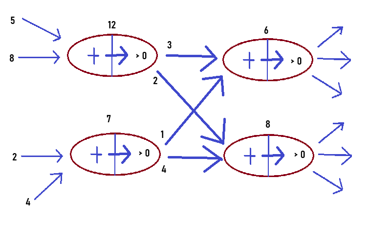 이제 1, 2번 뉴런에서 전송해준 값들로 3, 4번 뉴런 계산해보면 됩니다.