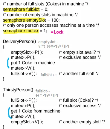 fullSlot은 머신에 콜라가 들어있는 칸의 수를 말하고 fullSlot이 1 이상일때만 콜라를 뽑을 수 있다. emptySlot은 콜라를 추가로 넣을 수 있는 공간을 말하며 1 이상이어야 콜라를 넣을 수 있다. mutex는 자판기에 동시에 한명만 접근할 수 있도록 Lock하는 역할이다