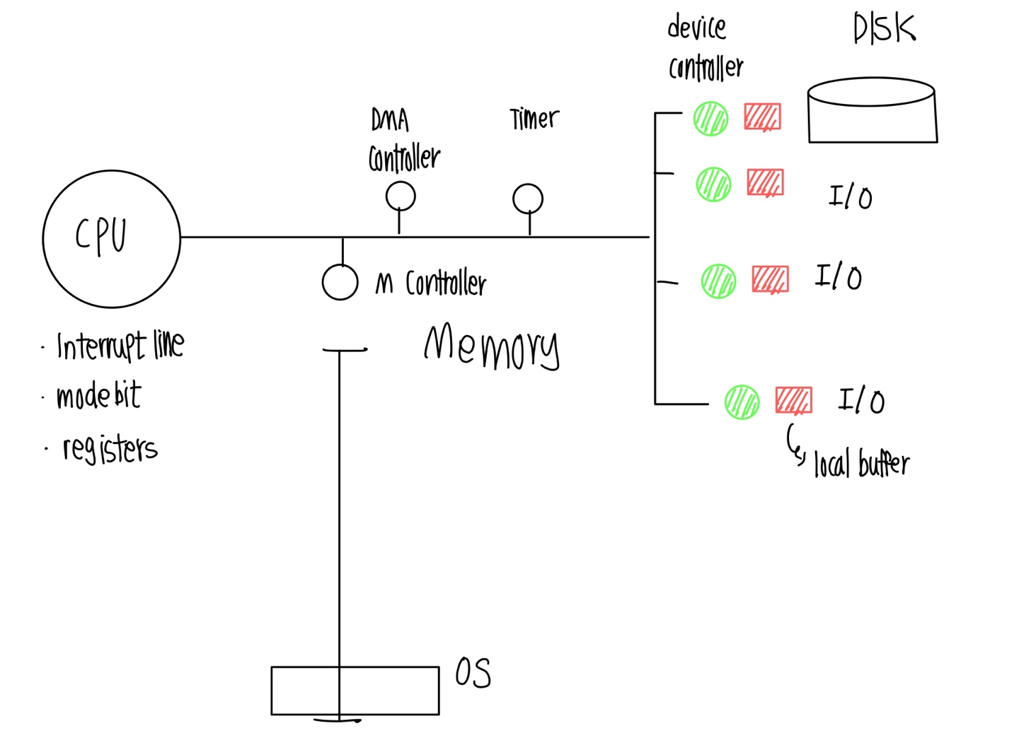 사용자는 I/O 디바이스에 직접적으로 접근하지 못하기 때문에 프로그램 실행 중 디스크에서 데이터를 읽어오거나 화면에 출력해야하는 I/O작업이 있다면 스스로 운영체제(커널)에게 CPU를 넘겨주고 운영체제가 전담 CPU(controller, 새끼CPU)에게 일을 시킨다 이렇게 일을 넘겨준 CPU는 또 다른 일을 하다가 I/O 디바이스가 일이 끝나면 새끼CPU가 CPU에게 인터럽트를 걸어 CPU 할당을 요청한다 할당 요청을 받은 CPU는 운영체제에게 넘어가고 전에 요청한 메모리 영역에 local buffer(data register) 데이터를 복사한다