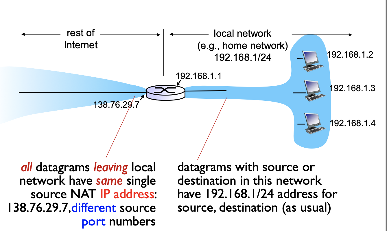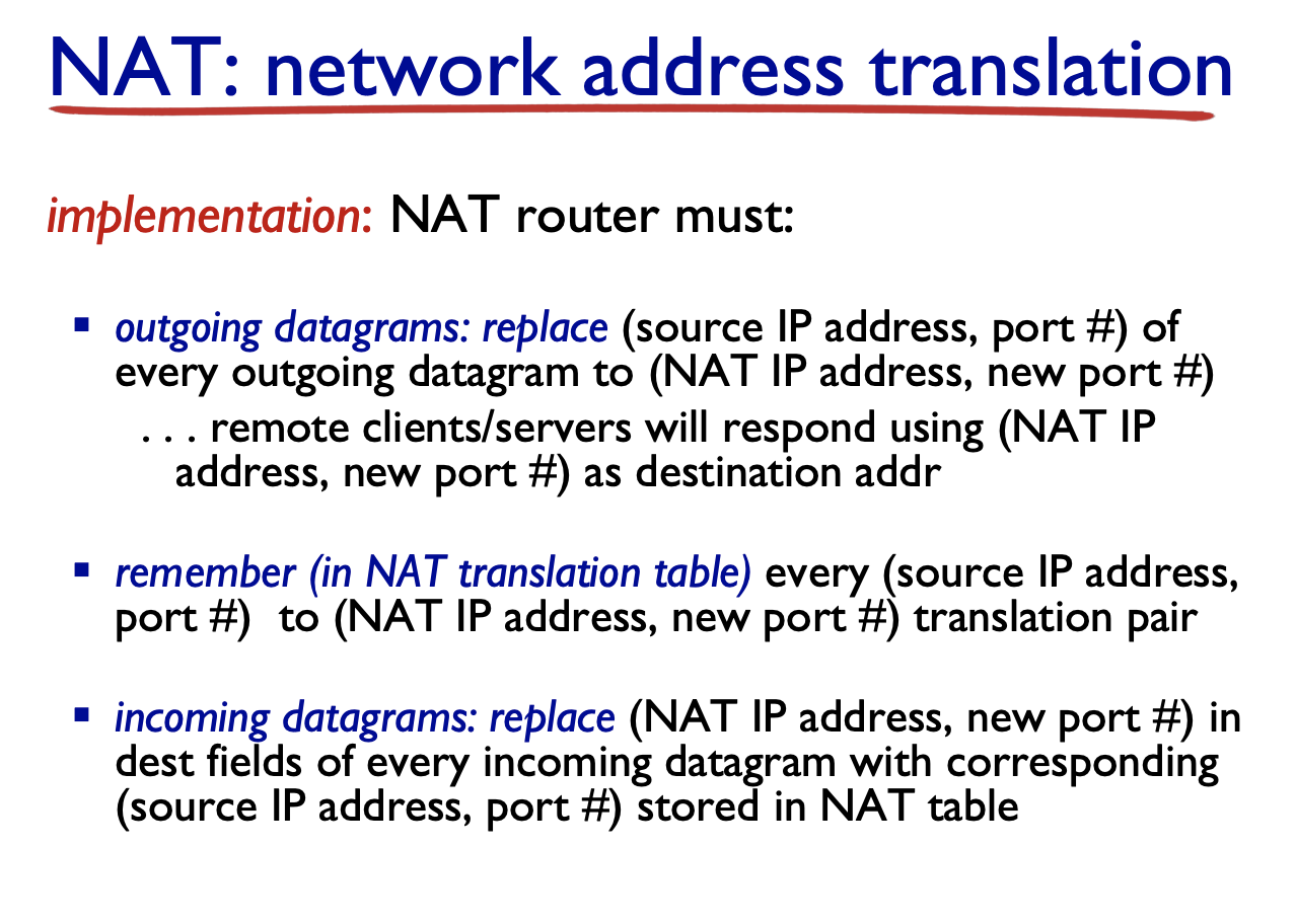 지금까지 각 layer 들의 특징을 배우면서, 각각의 계층이 가진 역할이 있는데, 지금 이 NAT 방식은 Network Layer에서 사용되는 방식임에도 불구하고 port 번호를 지정하여 통신하는 방식을 택하고 있는데, port번호는 Transport 계층의 범위를 침범했다는 의미에서 논란이 있고, 이를 IPv6로 주소 지정 범위를 늘리는 식으로 해결해야한다는 의견이 많지만, 사실 교수님 피셜 이 NAT 방식은 일반인들이 사용하기에 너무나도 편리한 방식이라 아마 대체되진 않을 것이라고 하셨다.