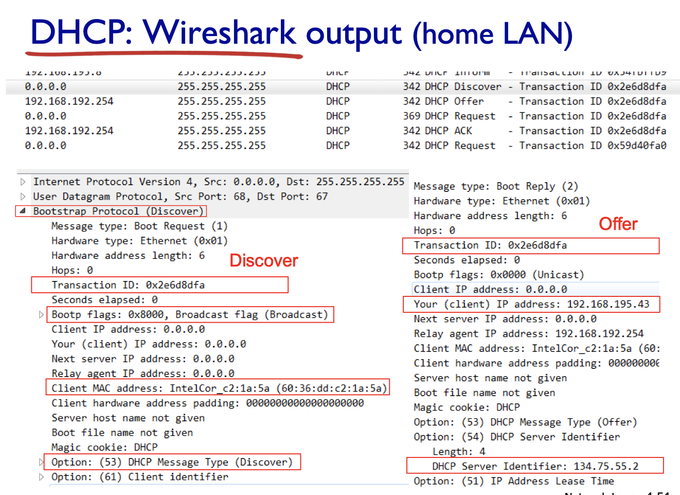 UDP가 upper layer 인 것을 확인할 수 있고, 처음에 client가 Transaction ID와 Broadcasting 정보, MAC address(?)를 포함하여 Discover 단계임을 브로드캐스팅하면, 서버에서 ID에 맞추어 IP 주소를 알려주고, 본인의 주소도 제공한다.