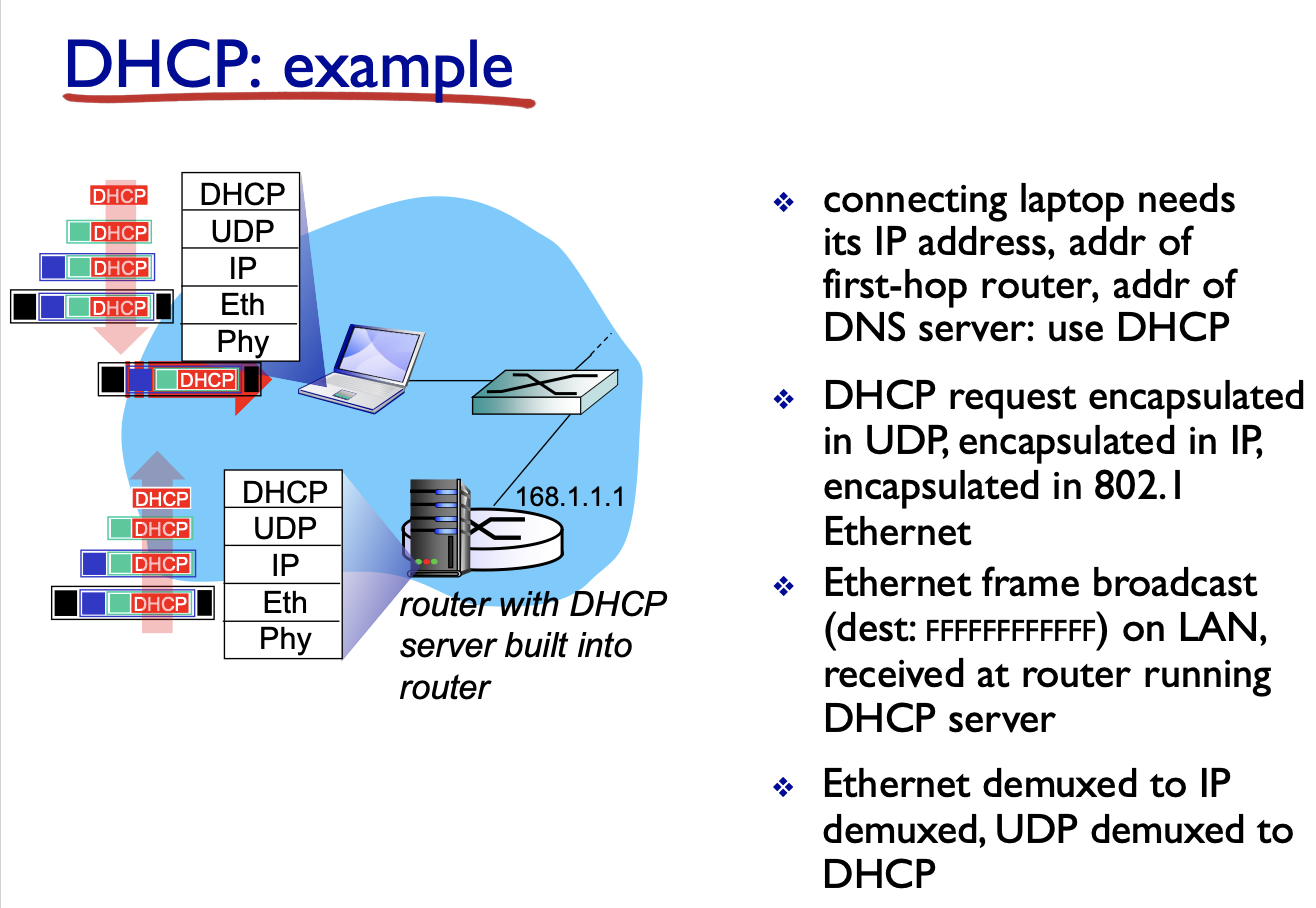 DHCP는 대부분 UDP를 사용한다. 위 그림처럼 헤더를 다 장착하고 밖으로 전송되어 4단계를 거쳐 IP주소를 할당받게 된다.