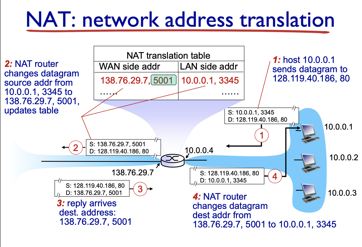 3. 각 기기가 인터넷에 나가면? NAT가 출발지 IP를 모두 138.76.29.7으로 바꿔서 보내준다. 대신 내부에서 어떤 디바이스가 보낸건지 기억해야 하므로, 포트 번호도 같이 붙여서 변환한다.