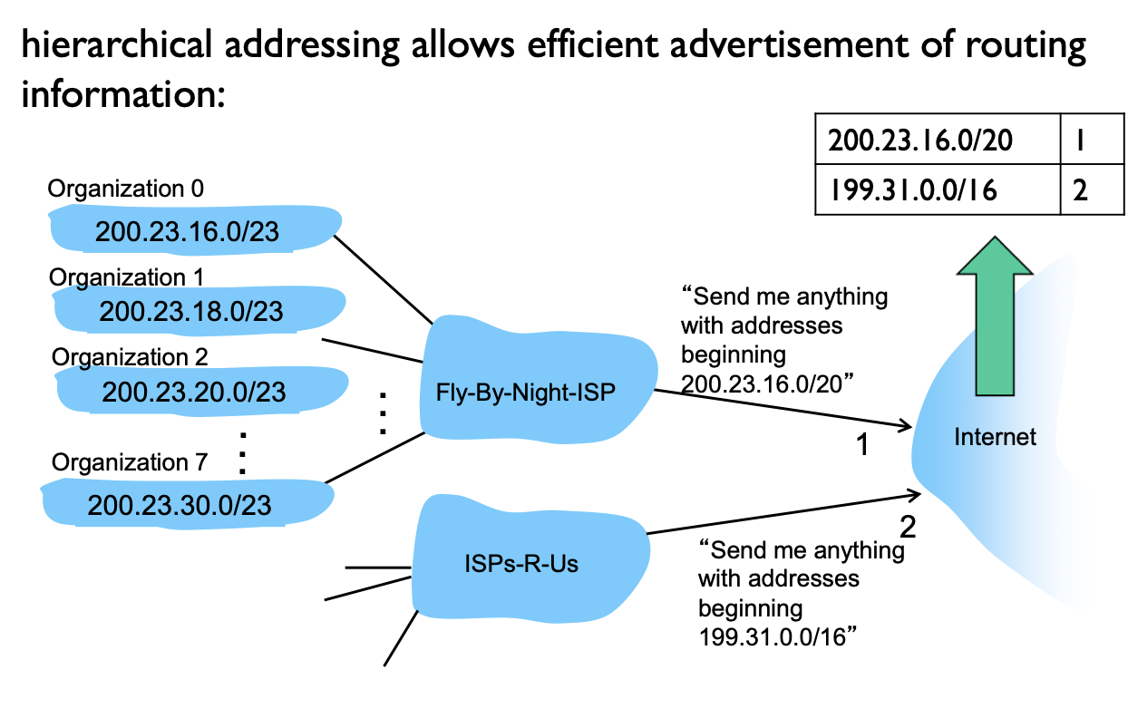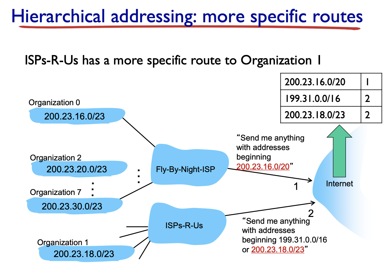 이렇게 Subnet에 따라 나누어 놓은 Organization 들을 묶어놓고, 라우팅 테이블에 200.23.16.0/20 에서 온 통신들은 다 1로 보내자 라는 정보를 적어놓는다. 그 아래에는 다른 네트워크로 연결된 주소로써 2번으로 연결되게 테이블에 적혀있다. 그런데,,
