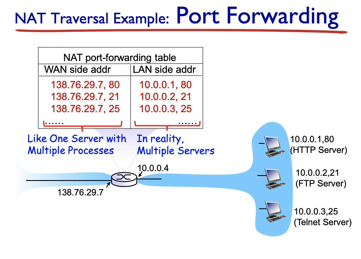 NAT traversal : 클라이언트가 연결을 원하면, 그 지정 Port를 미리 열어두어야 한다. 그 예로써 Port Forwarding 이라는 것이 존재한다.