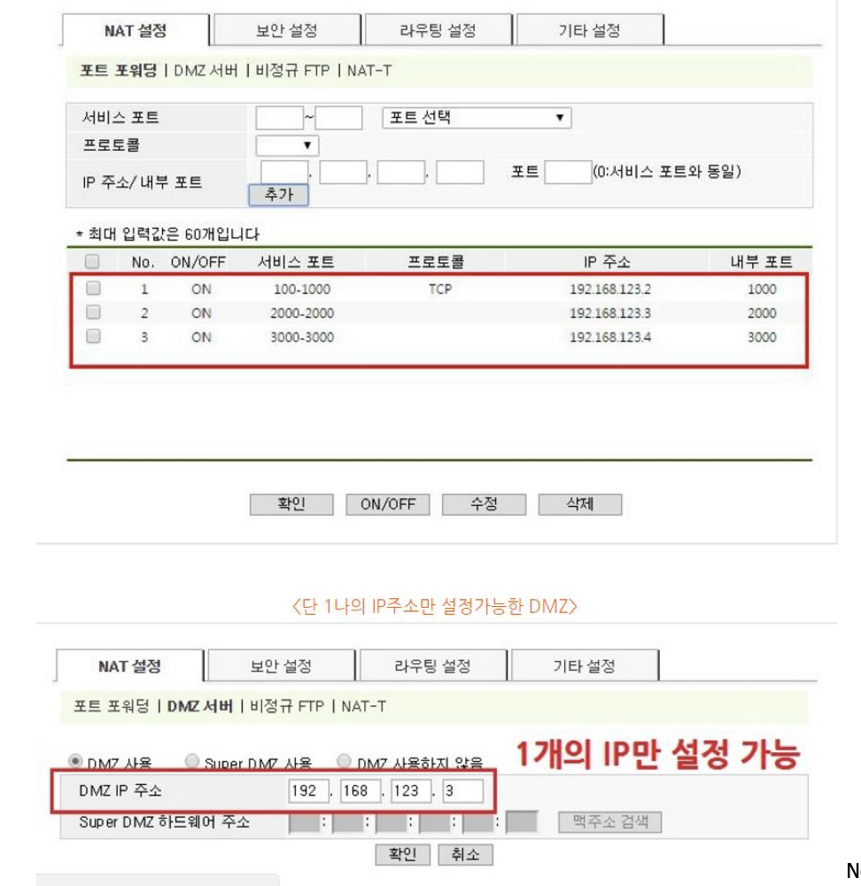 위 그림처럼 포트를 정해놓아 Port forwarding 이 가능하고, 아래는 DMZ 방식으로, 전에 설명했던 것 처럼 여러개의 Device를 나누어 놓는게 아니라, 그냥 나 혼자 쓴다 마인드로 설정하는 방식인데, 이는 해킹이 쉬워서 특정상황이 아니라면 사용하지 않는다.
