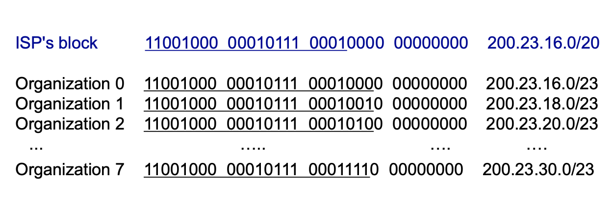 만약 우리 학교가 IP주소를 처음 할당받았다고 가정해보자. 저 위의 20bit짜리 블럭을 할당받았다고 했을 때, 이를 부서별로 나누어야 구조적으로 복잡하지 않기 때문에, Subnet을 3bit로 두고 나누어 놓은 사진이다. Organization을 보면 Subnet portion이 20에서 23으로 늘어난 것을 확인할 수 있다.