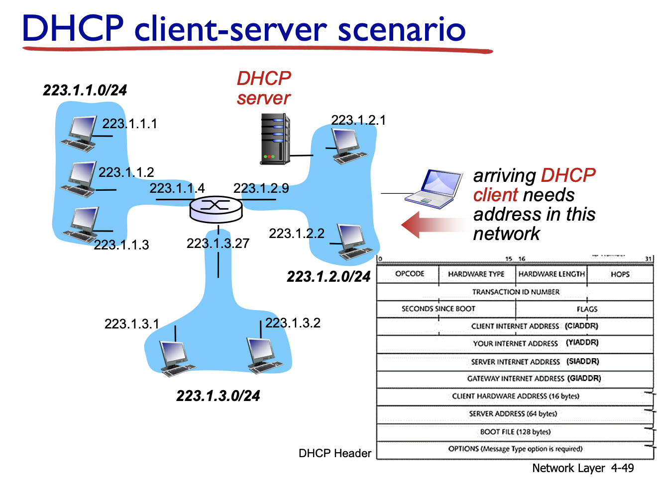 현재 새로운 DHCP client가 IP주소를 요구하고 있는 상황이다. DHCP server의 subnet part는 223.1.2.0/24 으로, IPv4 기준임을 고려했을때 32 - 24 = 8. 즉 2^8 개의 IP 주소를 host에게 할당할 수 있는 상황이다. ( 사실 2개를 빼면 2^8 => 256 에서 2를 뺀 254 개의 호스트가 할당 가능)
